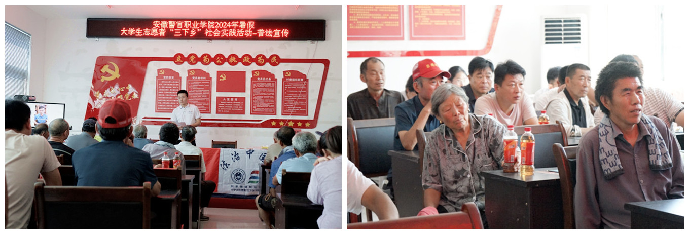 7月30日,正逢臨泉縣老集鎮的趕集日,普法宣傳團的隊員們在集市上搭建普法宣傳展臺,以專業知識為基礎,向廣大村民派發普法宣傳冊,圍繞與村民利益密切相關的領域開展法治宣傳,增強村民辦事依法、遇事找法、解決問題用法、化解矛盾靠法的思想自覺和行動自覺。接下來2天里,普法宣傳團的隊員們還深入前于莊村、南牛村、李湖村等地開展3場普法講座,通過案例分析、圖片演示、視頻播放等多種方式,用通俗易懂的語言向當地的老人、小孩講解法律相關知識及咨詢途徑,切實提高村民法律意識。