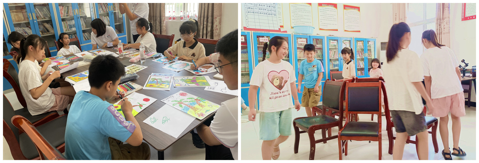 為豐富鄉村兒童的精神文化生活,關心留守兒童和困境兒童,7月30日上午,實踐團隊在臨泉縣老集鎮鎮政府舉行了圖書文具捐贈活動。捐書儀式后,隊員們通過破冰小游戲快速拉近了與孩子們之間的距離,與孩子們一起畫畫,分享各自的故事,現場氣氛溫馨融洽。