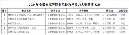 據悉,本次大賽共收到64所高職院校報送的參賽作品455件(審核通過443件),經過網絡初評和現場決賽,共評選出獲獎作品275件,其中一等獎作品48件、二等獎作品92件、三等獎作品135件。在本次大賽中,我院推薦的6支參賽隊有5支斬獲佳績。其中,學生處王世民教師團隊參賽隊作品《聚集職業心理素養,護航司警心路成長》榮獲公共課程組一等獎,警察系崔盼盼教師團隊參賽隊作品《模仿筆跡鑒定》和信息管理系魯貽錦教師團隊參賽隊作品《紅星宣紙數字化傳播方案設計》榮獲專業課程組二等獎,警察系孫麗偉教師團隊參賽隊作品《服刑中期罪犯心理評估與矯正》和信息管理系胡賢滿教師團隊參賽隊作品《倉儲與配送實務作業篇》榮獲專業課程組三等獎。