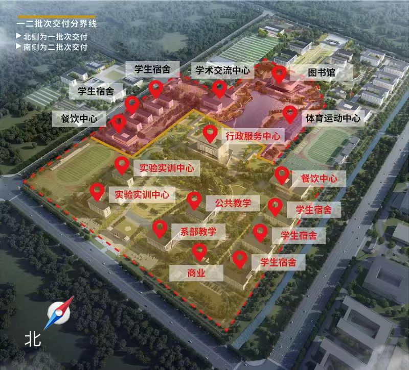 2024年9月14日,學院新校區(一期)建設工程規劃許可證辦理完成,共包含行政服務中心、學術交流中心、圖書館、體育運動中心、公共教學、系部教學、實驗實訓中心、學生宿舍、餐飲中心、商業服務、看臺、北校門、東校門等19個單體,總建筑面積26.5158萬平方米。