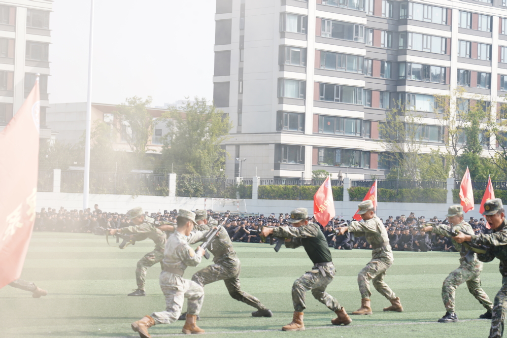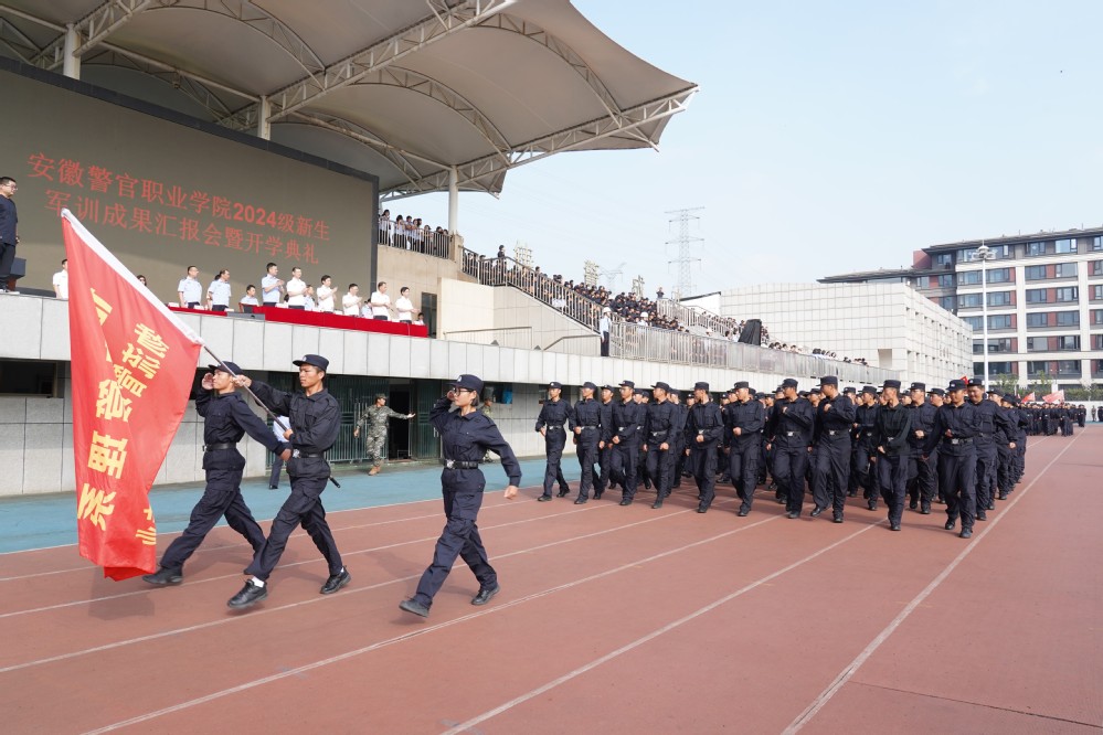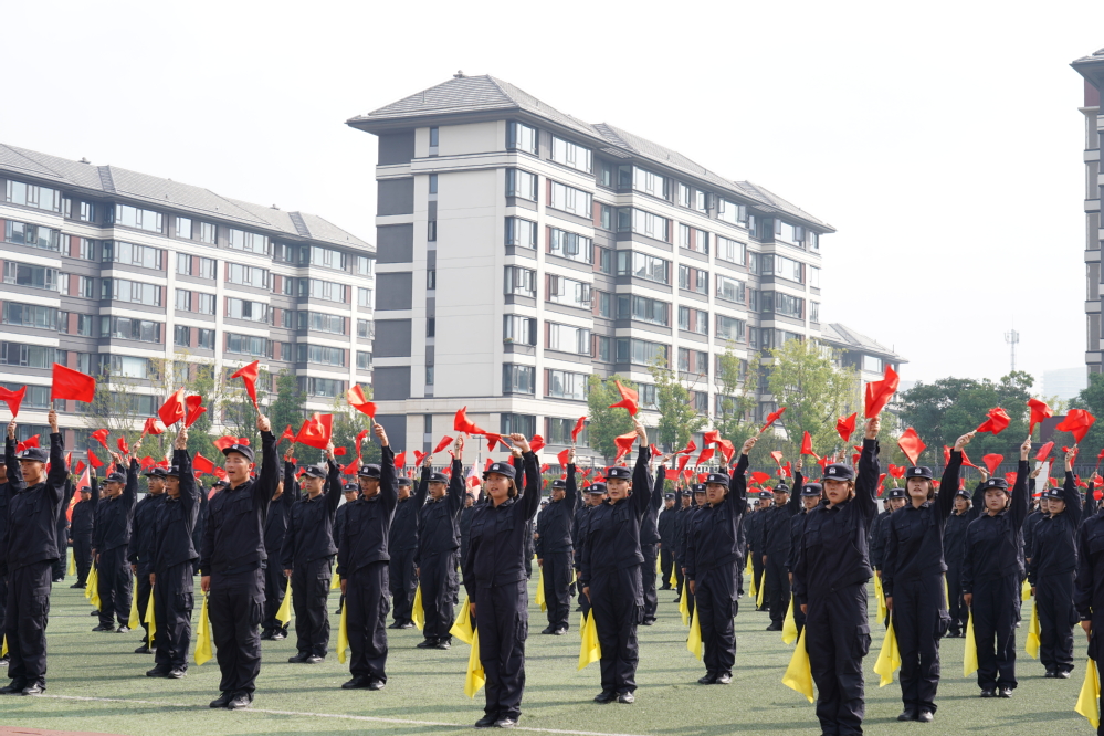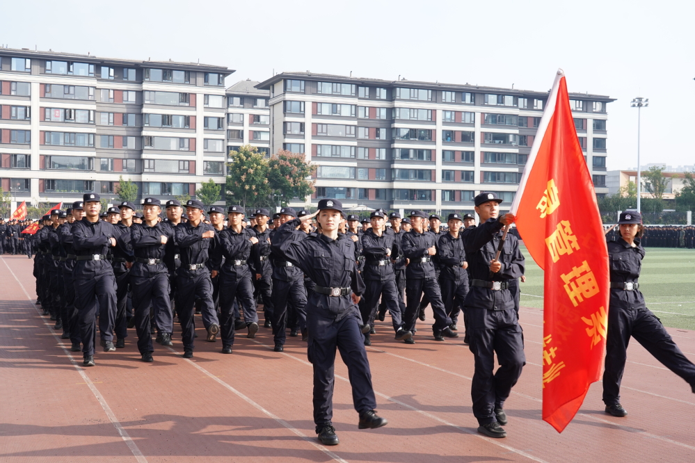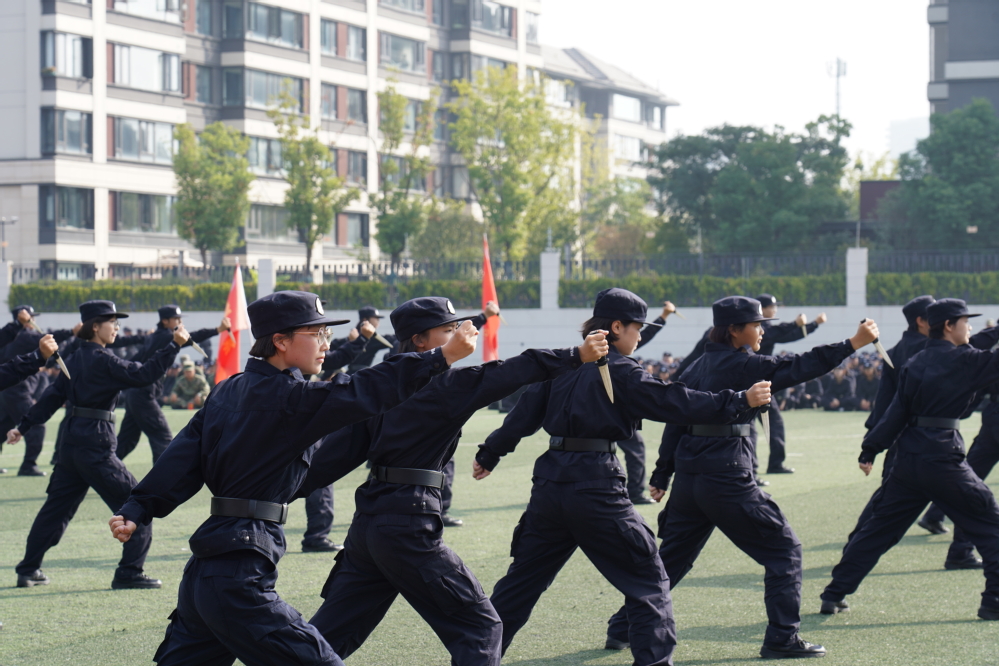 大會在莊嚴的國歌聲中拉開帷幕。升國旗儀式后,軍訓課目訓練成果展示正式開始。2024級參訓同學組成30個特色方陣,意氣風發、斗志昂揚,踏著整齊的步伐、喊著嘹亮的口號經過主席臺。韻律操拉開序幕,輕盈舞動,煥發青春無限活力;匕首操緊隨其后,鋒利出鞘,映射出冷靜果敢之氣;警棍術接踵而至,精準操控,盡顯專業卓越風采;擒敵拳凌厲登場,拳拳到位,彰顯勇士無畏之心;最終,旗語華麗壓軸,智勇交織,于全場閃耀奪目光芒。