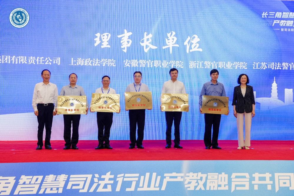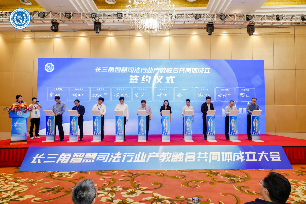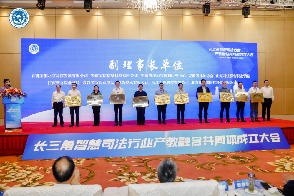 10位與會領導和嘉賓共同啟動了按鈕,宣布“長三角智慧司法行業產教融合共同體”正式成立。會上,舉行了共同體理事長單位、副理事長單位等授牌儀式,校企合作簽約儀式,播放了智慧司法行業產教融合、校企合作成果展示視頻。