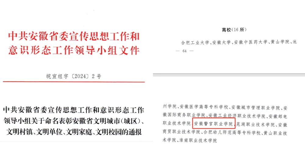 近日,根據(jù)中共安徽省委宣傳思想工作和意識(shí)形態(tài)工作領(lǐng)導(dǎo)小組《關(guān)于命名表彰安徽省文明城市(城區(qū))、文明村鎮(zhèn)、文明單位、文明家庭、文明校園的通報(bào)》(皖宣組字〔2024〕2號(hào)),安徽警官職業(yè)學(xué)院榮獲安徽省第二屆文明校園榮譽(yù)稱(chēng)號(hào)。