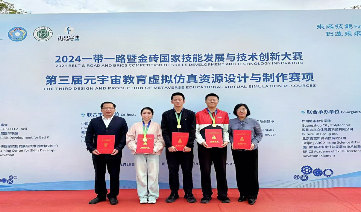11月15日至17日,2024年“一帶一路”暨金磚國家技能發展與技術創新大賽之第三屆元宇宙教育虛擬仿真資源設計與制作賽項全國總決賽在廣州城市職業學院舉行。學院司法信息安全專業三名參賽同學以優異的成績榮獲全國一等獎,獲得金牌,張娜和姚峰兩位老師獲“優秀指導教師”稱號,學院榮獲“最佳組織獎”榮譽稱號。