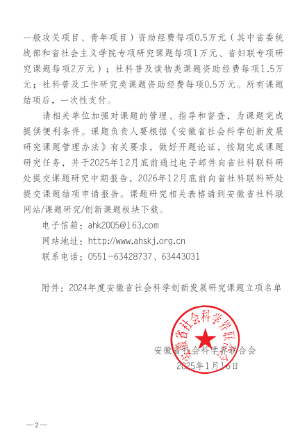近日,安徽省社會科學(xué)界聯(lián)合會發(fā)布了《關(guān)于2024年度安徽省社會科學(xué)創(chuàng)新發(fā)展研究課題立項的通知》(皖社科聯(lián)通字〔2025〕1號),我院教師桑佳佳申報的《高職院校產(chǎn)教融合協(xié)同育人模式研究》、程丹申報的《數(shù)字技術(shù)賦能安徽優(yōu)秀傳統(tǒng)文化傳承研究》均獲批一般攻關(guān)資助項目。