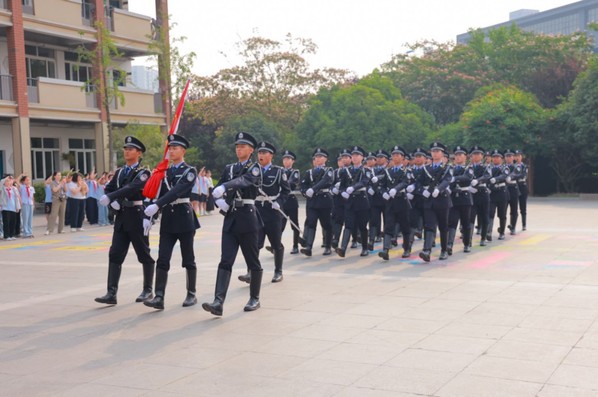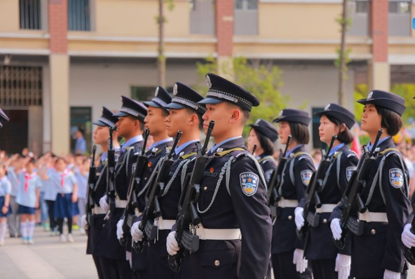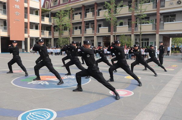 當日清晨8時,活動在莊嚴的升旗儀式中正式拉開序幕。學院國旗護衛隊步伐鏗鏘有力,護送國旗入場。全體師生莊嚴肅立,齊聲高唱國歌,五星紅旗迎著晨風冉冉升起,獵獵飄揚。緊接著,警務技能方陣帶來精彩絕倫的表演,隊員們一招一式剛勁有力,盡顯青春蓬勃風采,這不僅是一場視覺盛宴,更似一束光,點燃了孩子們對規則的敬畏之心與守護正義的向往之情。
