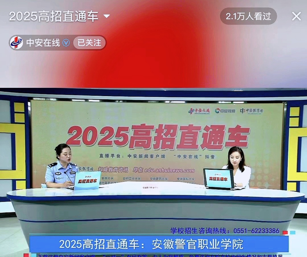 招生季期間,學院應邀參與省招生考試院、中國教育在線、中安在線等媒體現(xiàn)場直播,開展官方招生政策線上宣講,相關內容在抖音、微信等主流平臺同步推送,登上“學習強國”和微博同城熱搜,累計觀看量超300萬人次,點贊量破27萬,讓“安警名片”成為考生和家長心中極具辨識度、高認可度的職教品牌。