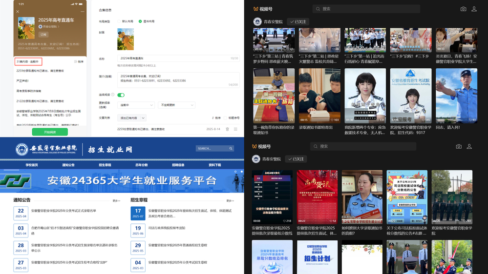 多維宣傳矩陣精準發(fā)力,“云展示”擴大品牌影響力。學院依托招生官網、公眾號、視頻號、抖音號、快手號“五位一體”宣傳矩陣,常態(tài)化開展招生宣傳。針對新高考“院校+專業(yè)組”志愿填報模式改革,各系、院、部在院招生辦統(tǒng)籌下,深度提煉專業(yè)特色與辦學成果,完成6個招生專業(yè)視頻拍攝,通過“安徽警院”“青春安警院”等官方平臺立體展現(xiàn)“安警風采”。截至目前,“青春安警院”公眾號發(fā)布招生信息31條,累計瀏覽量近13萬人次;視頻平臺發(fā)布招生視頻14條,全網播放量近150萬,4場直播累計觀看超180萬人次。