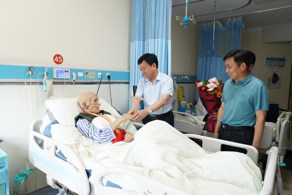 8月27日上午,省司法廳黨委委員、副廳長唐華軍,學院黨委書記桂勇一行前往醫院,看望正在療養的96歲高齡抗日離休干部凌德保同志。唐華軍細致了解凌老的治療進展和日常生活安排,希望他安心休養、祝福他健康長壽,并為他頒授“中國人民抗日戰爭勝利80周年”紀念章。唐華軍叮囑相關工作人員要帶著感情,一如既往地關心關愛老戰士、老同志,深入細致做好服務工作,讓他們安享晚年。