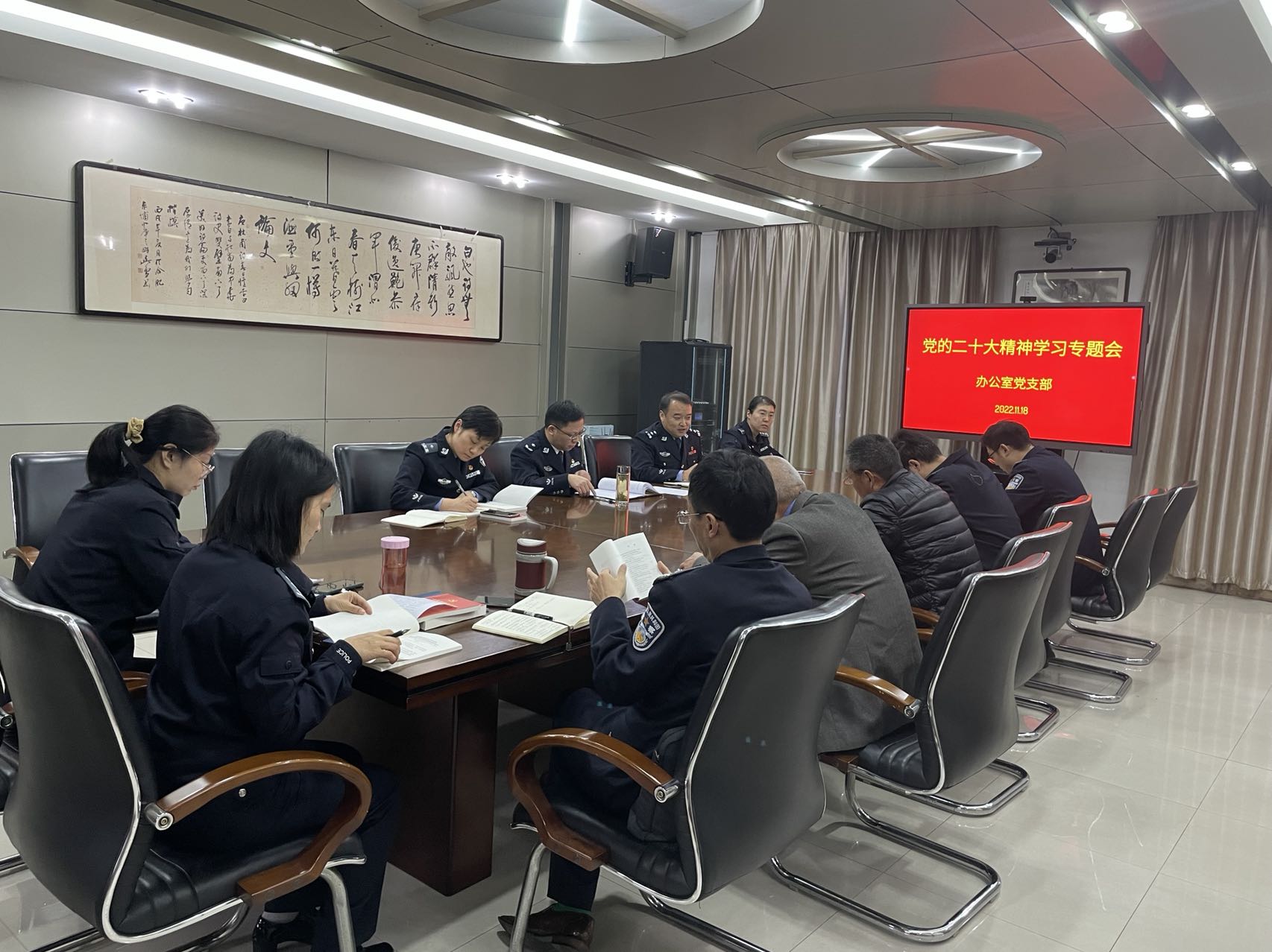 會上,操申斌帶領辦公室全體人員深入學習了黨的二十大的重大意義,領悟了報告中講解的過去五年工作和新時代十年的偉大變革、闡釋的習近平新時代中國特色社會主義思想的世界觀方法論和新時代新征程黨的使命任務、解讀的全面建設社會主義現代化國家的目標任務和以自我革命引領社會革命的重要要求。