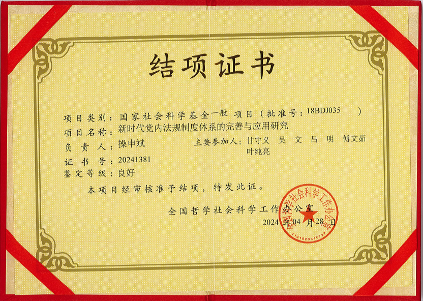 近日,全國哲學社會科學規劃辦公室公布了2024年4月國家社科項目結題情況,學院操申斌教授主持的國家社科基金一般項目《新時代黨內法規制度體系的完善與應用研究》(批準號:18BDJ035),通過審核順利結題,鑒定獲批“良好”等級。