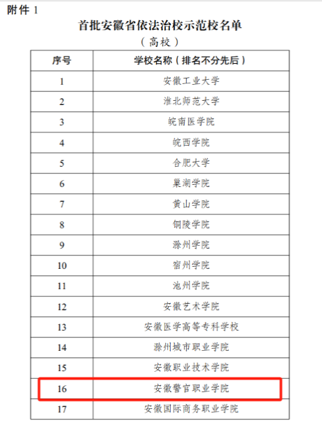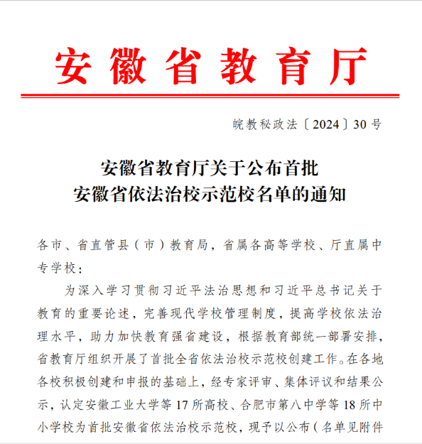 近日,安徽省教育廳發布《關于公布首批安徽省依法治校示范校名單的通知》(皖教秘政法〔2024〕30號),學院獲評安徽省首批依法治校示范校。全省近80所高職院校中,僅5所入選。