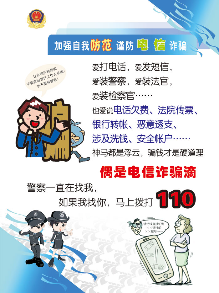 防范電信網絡詐騙有招,做到以下三點就不會被騙:不信 不理 不匯款。 在信息化飛速發展給人們帶來便捷的今天。各類高科技犯罪也隨之蔓延。而他們的所為也給很多人帶來精神上的刺激和財務上的損失。所以,對于各類信息,我們要我有效甄別,以免給自己帶來不必要的損失。 1、短信詐騙:常見的主要有中獎、語音信箱留言、點歌、快遞包裹、冒充親友等,對于以上的各種手法,如果在現實生活中遇到,首先不要盲目的去滿足對方的各類要求,而是要通過了解去甄別信息的真偽。這樣可以避免很多不必要的麻煩。2 2、網絡中獎詐騙:最常見的主要有活動慶典詐騙、冒充知名網站詐騙、幸運抽獎等。對于網頁彈出這樣的窗口,首先不要點擊也不要相信天下會掉下來餡餅,如果點擊進去后如有要求填寫各類信息,不要亂填寫,因為這時候你會把自己的各類信息泄露了。得不償失。所以做到不信不理非常重要。 3、電話詐騙:常見的有公司推出活動低價促銷、電話欠費、消費透支、退稅電話、車禍電話、彩票電話、透支電話、點歌電話等,對于這樣的來點,首先要保持頭腦冷靜,不要盲目去做所謂的相關要求或手續。有效的克制和清醒的頭腦是避免損失的關鍵點。 安全提示: 1、如果電話欠費,電信公司會發送欠費催款單,而且電信通常是在月底和月初由電腦語言提示"電話欠款",并非人工直接轉接。 3、千萬不要相信所謂的購車退稅、購房退費等謊言,如果真有退稅政策出臺,稅務部門會通過媒體發布權威信息,不會以電話形式通知。 4、銀聯客服中心告知你信用卡透支等情況時,可要求對方說出你的姓名、住址、信用卡賬號等資料以核實。如果你對帳戶消費有疑問,可向銀行查詢,各銀行都設有24小時固定客服熱線。 5、戒除貪念,天下沒有免費的午餐。 6、接到陌生電話時,注意核實對方真實身份,不可輕易匯款。同時要跟相對人或朋友核實信息的真偽。 最后,天下沒有免費的午餐更不會天下掉餡餅。如果不幸受到損失一定要第一時間報警,同時保存好相應的各類單據,號碼。總之,做到不信不理不匯款。就不會有損失。