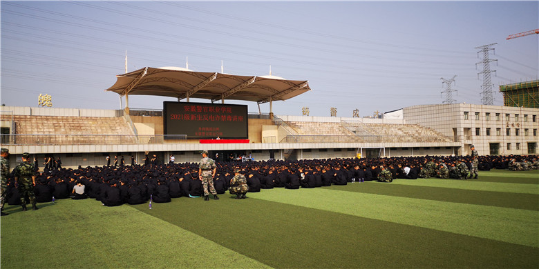 9月17日上午,學院聯合合肥市公安局井崗鎮派出所在學院運動場開展了一次專題報告會,合肥市公安局井崗鎮派出所副所長王聰聰就“反電詐、禁毒”為主題進行宣講,2021級全體新生聆聽了此次講座。