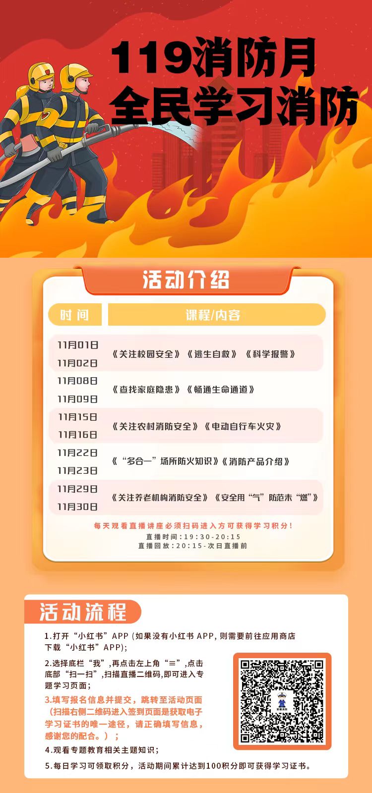 為推動社會單位關注消防、學習消防、參與消防新格局,安徽省消防救援總隊將于11月組織開展消防安全公開課,請全體師生收聽收看消防安全公開課。