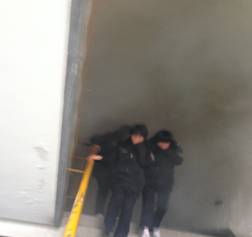 警報吹響的瞬間,煙霧彈被燃放,教學樓內(nèi)外濃煙滾滾,“火勢”強烈。各班同學在現(xiàn)場指揮員和班主任的指導下,捂住口鼻,緊張而有序地從“失火”樓道安全逃離。