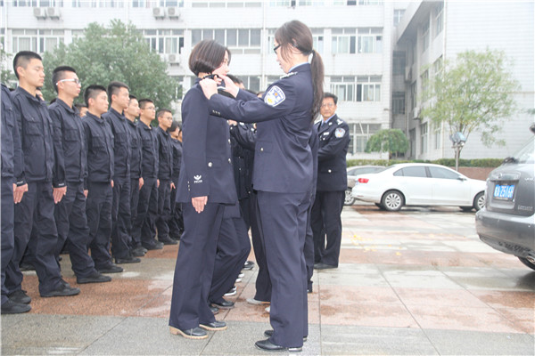 授銜儀式在徐愛民同志鏗鏘有力的命令下開始,系學生科老師為五名新生代表佩戴了警銜、領花等警銜標識。簡單而莊嚴的儀式讓全體授銜的新生感受到了警徽的神圣和莊嚴,全體新生一致表示,一定要做到警容嚴整、儀態端莊、語言文明、行為規范;一定會遵守學院的警務化管理制度,服從管理,勇擔責任,自覺維護自身良好形象;一定會努力學習專業知識,再接再厲,以實際行動為警服增光,為警徽添彩,爭做一名優秀的警院學生。( 王 躍 )