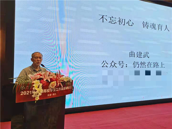此次高級(jí)研修班圍繞“當(dāng)前我國高校學(xué)生工作隊(duì)伍建設(shè)現(xiàn)狀、發(fā)展的研究”“新時(shí)代高校學(xué)生工作隊(duì)伍專業(yè)素質(zhì)能力提升研究”“新時(shí)代高校輔導(dǎo)員工作室建設(shè)的思考與探索研究”“新時(shí)代高校全員全過程全方位育人機(jī)制研究”“新時(shí)代高校輔導(dǎo)員職業(yè)發(fā)展體系研究”等方面,通過專家報(bào)告、經(jīng)驗(yàn)交流、分組研討、輔導(dǎo)員沙龍和考察學(xué)習(xí)等形式展開研討。在專家報(bào)告環(huán)節(jié)中,時(shí)代楷模、最美奮斗者、全國優(yōu)秀教師、大連海事大學(xué)馬克思主義學(xué)院教授、博士生導(dǎo)師曲建武等6位專家作了專題報(bào)告。曲建武教授以《不忘初心 鑄魂育人》為主題,結(jié)合自身39年的工作經(jīng)歷和工作實(shí)際,講述自己的故事,從文化視角、政治視角、辦人民滿意的高等教育視角三個(gè)方面闡釋思政工作如何鑄魂育人,論述“培養(yǎng)什么人、怎樣培養(yǎng)人、為誰培養(yǎng)人”這一根本性問題。
