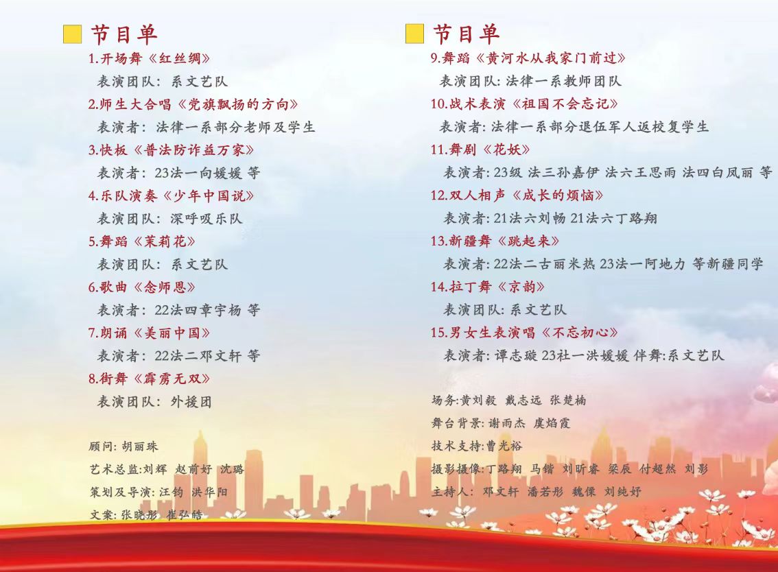 為深入貫徹“立德樹人”根本任務(wù),進(jìn)一步推進(jìn)課程思政和校園文化協(xié)同育人機(jī)制落實(shí),法律一系于2023年12月15日下午在學(xué)術(shù)報(bào)告廳隆重舉行了以“激揚(yáng)青春夢,奮進(jìn)新征程”為主題的文藝匯演,本次匯演由法律一系師生共同參與、精心策劃,現(xiàn)場精彩紛呈,氣氛熱烈歡快,匯演取得圓滿成功。