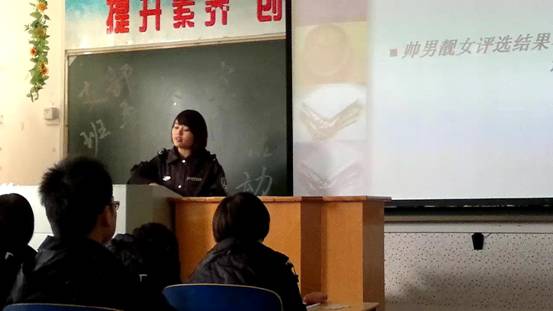 “非警勿擾”以“非誠勿擾”為原型,四男五女上臺展示警院學子的風采,闡述警務化管理的要求以及好處。四男以博得在場嘉賓的青睞為準,五女以博得在場男嘉賓為準,最后評選本次活動的帥男美女。整個活動過程,全班同學熱情高漲,掌聲四起,笑聲不斷。最后活動在大熊每周天氣預報中圓滿結束。