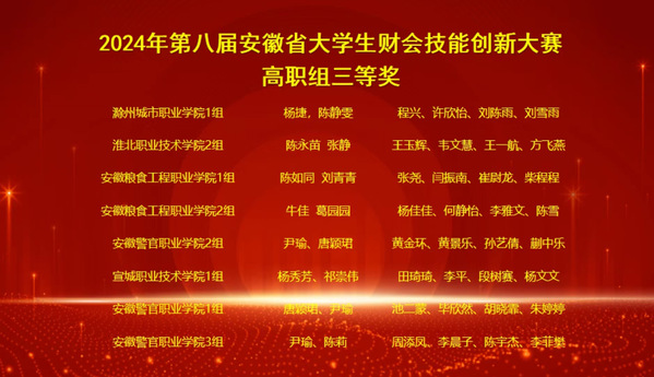 11月24日,由我系會計信息管理專業黃金環、周添鳳、池二蒙等12名同學組成的3支代表隊,在安徽省教育廳主辦的“2024年安徽省大學生財會技能創新大賽”中,均榮獲三等獎。