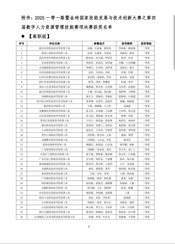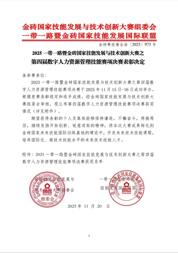 近日,2025“一帶一路”暨金磚國家技能發展與技術創新大賽第四屆數字人力資源管理技能賽項全國總決賽圓滿落幕。由公共管理系勞動與社會保障專業汪俊碩、王志遠、許旺等三名同學組成的代表隊,從來自全國多所高校的160支參賽隊伍中脫穎而出,榮獲二等獎。