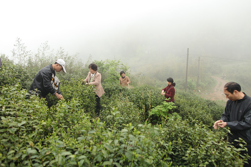 村莊四周的山坡上,一塊塊整齊的茶園,滿目翠綠。眼下正值茶葉生長旺季,采茶的村姑們一字排開,全神貫注地采摘嫩芽,系在腰間的圍裙里,早已鼓穰穰了,我們也趕緊貼上去,加入了義務摘茶的行列。這真是: