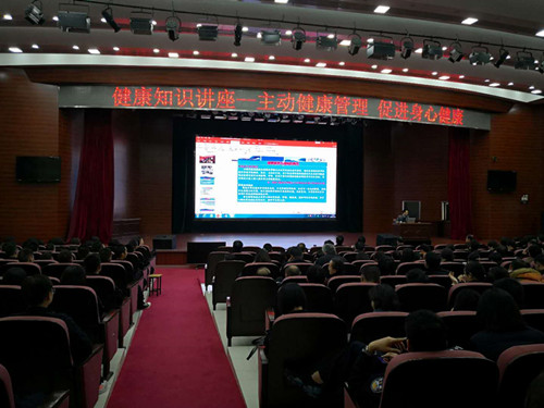 講座由中國科學技術大學附屬第一醫院(安徽省立醫院)副主任醫師、副教授李金虎主講,題目為《主動健康管理,促進身心健康》。他從健康的概念、影響健康的復雜因素講起,向大家逐層講述了健康風險因素的零級預防、健康管理與慢病的概念、我國慢病現狀及發展趨勢、維護健康的四大基石、生活方式與健康的關系以及自我健康管理的基本方法。李主任指出:大家由于忙碌的工作,頻繁的應酬,還有家庭和工作的壓力,給大家的健康帶來了很大的危害,使很得多人處于亞健康狀態,如果思想上不引起重視,久而久之就會影響生活的質量,甚至會危害生命。李主任還特別強調了維護健康的四大基石,要求大家合理膳食、適度運動、戒煙限酒、心情舒暢….