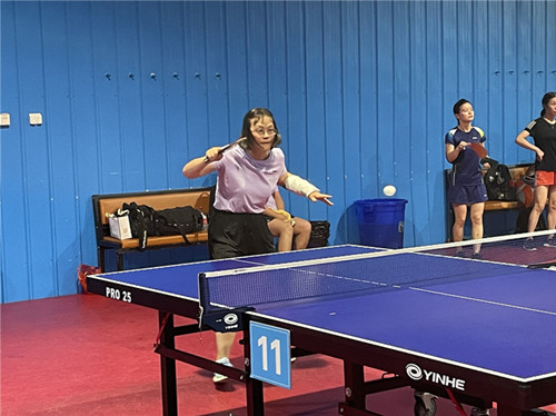 在眾多運動員中,有一位選手格外引人注目,只見她左手腕部被紗布纏得嚴嚴實實,半懸空中,右手不停的揮舞著球拍,忽左忽右,忽扣忽拉,發球時咬緊牙關勉力支撐。就是這么一位選手,經過兩日鏖戰,她領銜的女子團體斬獲女團第四名,同時摘取乙組女子單打第四名。她就是來自安徽警院的司法廳乒乓球(企事業組)運動員何詠梅。