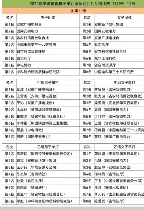 另外,陳愛武獲乙組女子單打第8名,在11日舉行的乒乓球男子單打比賽中孫雯獲乙組男子單打第5名,徐曉明獲第6名。省司法廳代表隊載譽而歸!