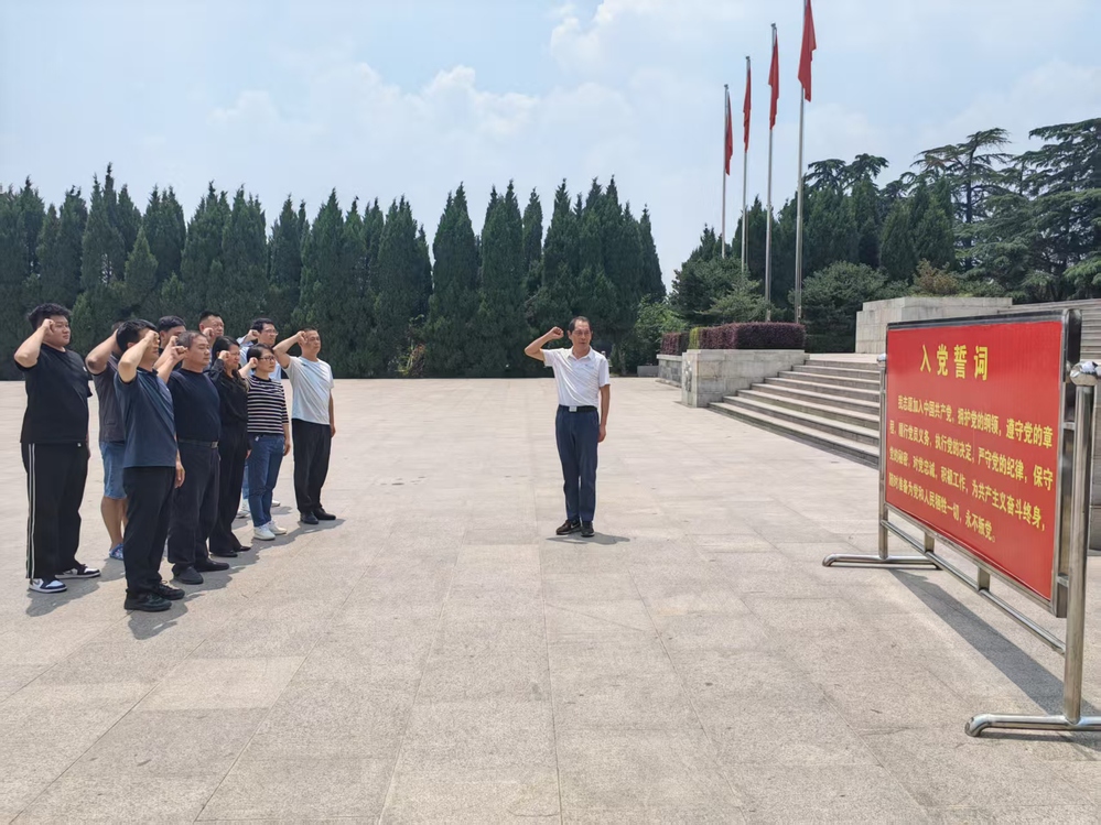 上午10:30,黨員們懷著崇敬的心情抵達烈士陵園。陵園內莊嚴肅穆,松柏蒼翠,烈士紀念碑巍峨聳立,仿佛在訴說著那段波瀾壯闊的革命歲月。在淮海戰(zhàn)役烈士紀念塔前,在支部書記呂正保的帶領下,黨員們舉起右手,緊握拳頭,莊重宣誓,重溫入黨誓詞。