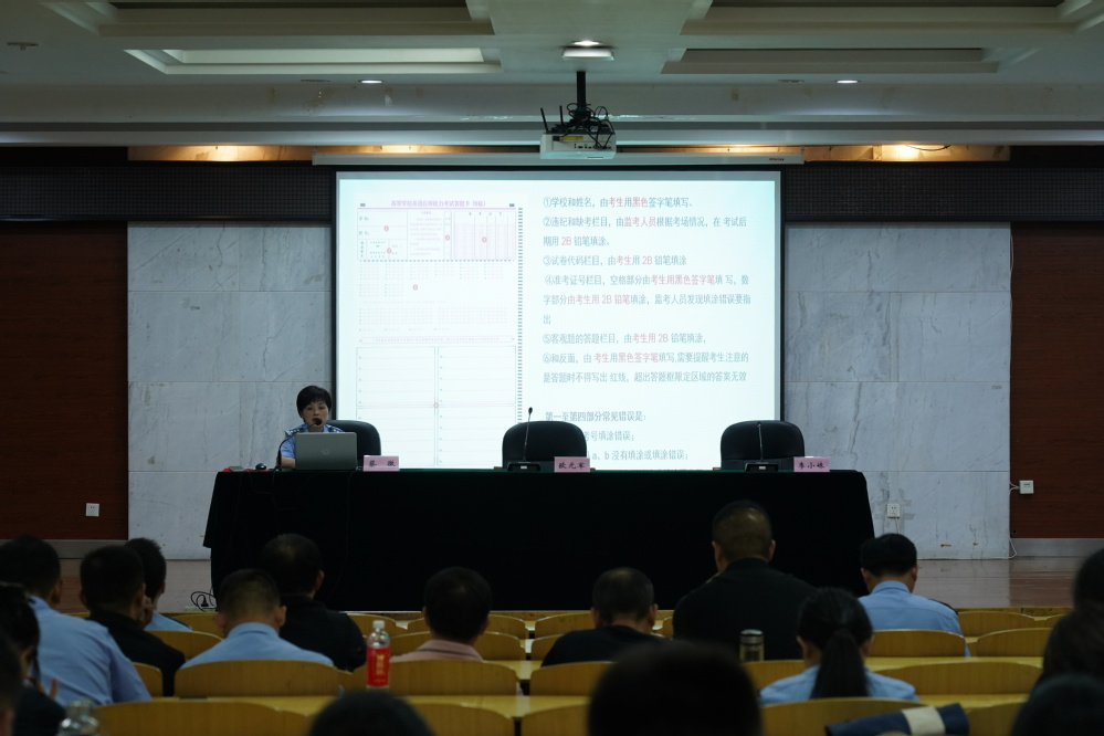 6月14日下午,學(xué)院召開全體監(jiān)考、考務(wù)人員培訓(xùn)會(huì)。院基礎(chǔ)部副主任李小妹就考場監(jiān)考紀(jì)律和重要注意事項(xiàng)等內(nèi)容進(jìn)行強(qiáng)調(diào)和說明,英語教研室副主任蔡徽就監(jiān)考人員的操作規(guī)程和應(yīng)急處理等內(nèi)容進(jìn)行考前培訓(xùn)。