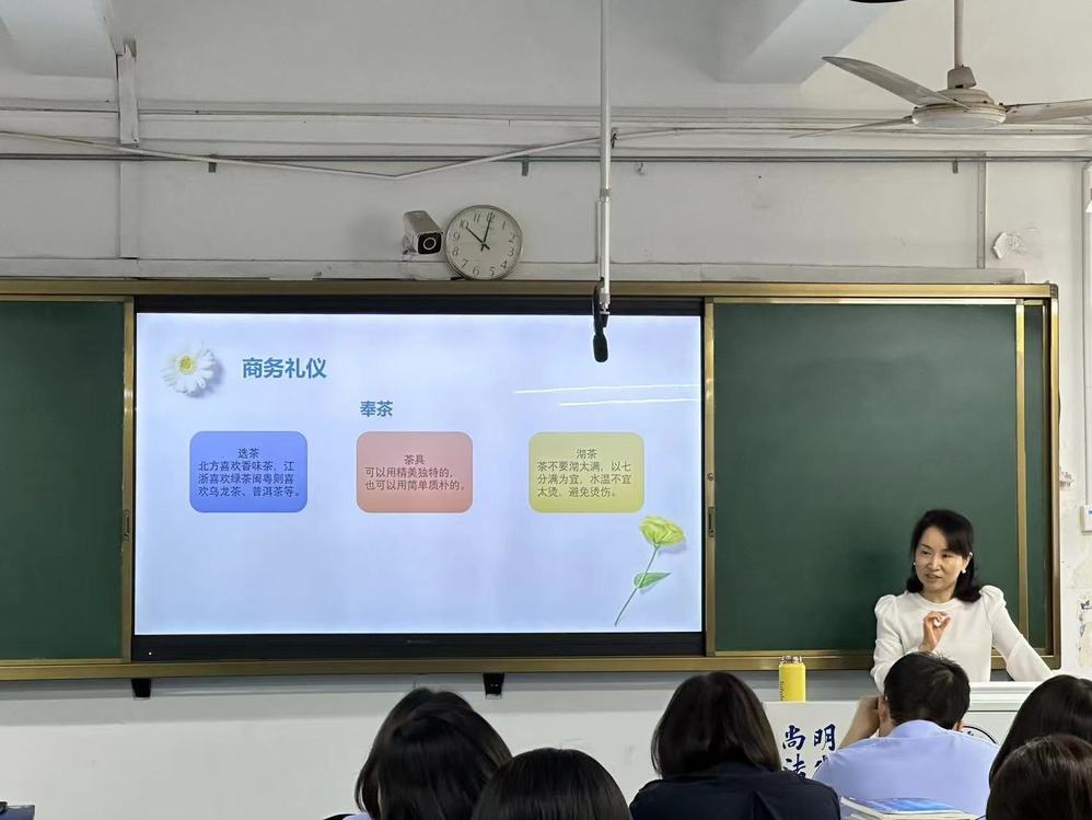 基礎部副主任李小妹(主持工作)、張雯,漢語教研室主任祁郁到場聽課。課堂上,劉曉敏老師通過生動的講解和互動演示,向學生們展示了商務場合中奉茶的基本禮儀和操作規范。教學過程中,劉曉敏老師教態自然,教學節奏把握得當,課堂互動環節豐富。學生們參與積極,氣氛活躍。通過實際操作與示范,學生們對商務禮儀有了更深刻的認識和理解。課后聽課老師與授課老師進行了評議交流,教學效果得到一致好評。