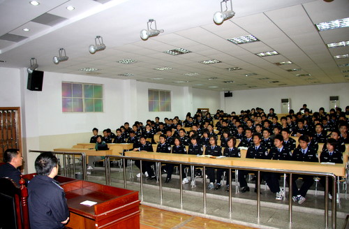 本網訊 (王維亞 學生記者 朱園園)目前人民法院司法警察的主要職能體現在哪里?我院司法警務專業學生如何全面認識司法警察?為了讓實踐教學與理論傳授融會貫通,院警察系于118日邀請了合肥市中級人民法院法警支隊副支隊長羅駿在學院模擬法庭,就司法警察理論與實務作了一場精彩的講座。講座由警察系主任潘家永主持,來自該系06級和07級司法警務專業的200多名學生認真聆聽了講座。
