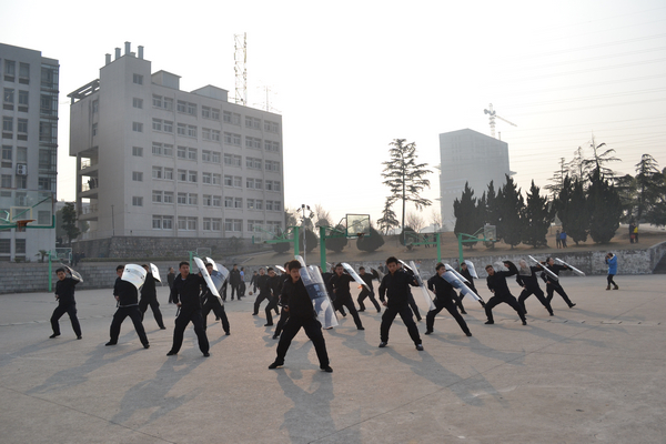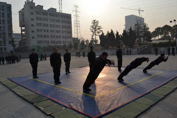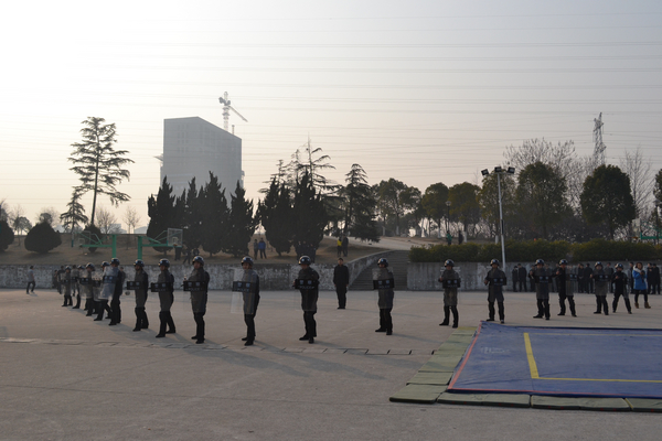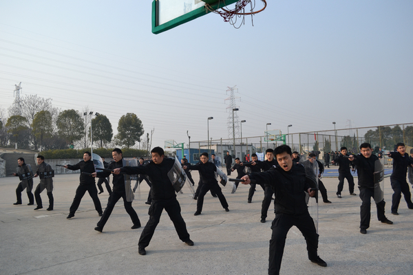 此次匯報表演分為六個內容:首先由是集體擒敵拳,其次由是警棍盾牌操,隨后穿插了武術散打和模擬對練兩個單人實戰環節,接下來由是防爆隊形演練,最后是集體倒功表演。整場演出環環相扣,緊湊激烈,觀看教師和圍觀學生不時響起熱烈的掌聲。