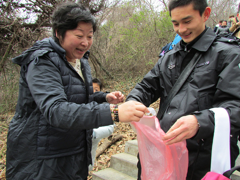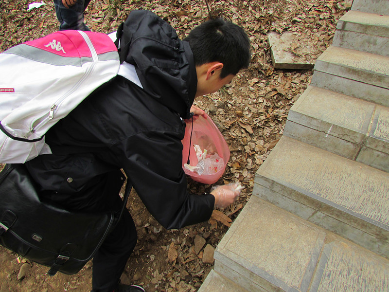 上午9:45分到達目的地,發放勞動工具和垃圾袋之后,團員們每人手里拿著一個大塑料袋,迅速投入環保活動中去,一邊登山一邊環顧四周尋找被丟掉的廢棄物,時不時停下來將山路上的塑料包裝袋、煙蒂、果皮、紙屑等撿起放進垃圾袋中。