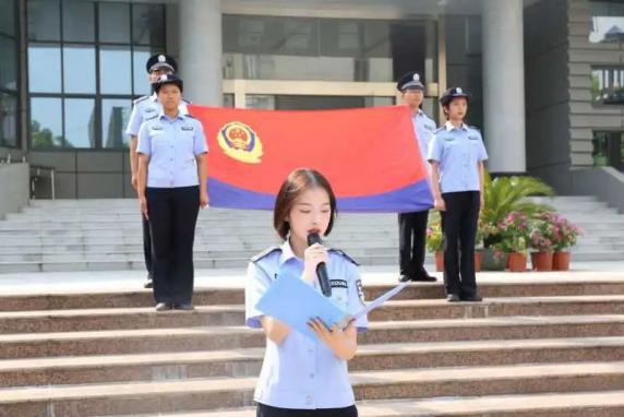 警旗高揚,數百名師生共舉右手,大聲宣誓:對黨忠誠、服務人民、執法公正、紀律嚴明;堅定純潔、讓黨放心、甘于奉獻、能拼善贏!