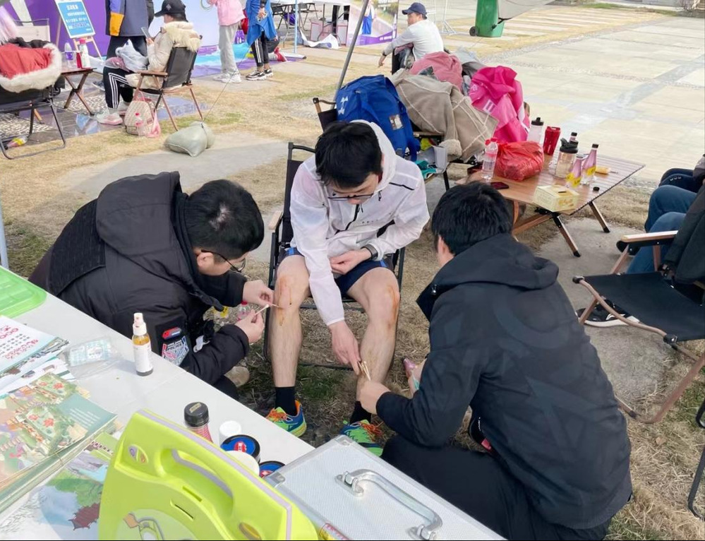 為保障賽事安全、有序、高效地舉辦,警務戰訓教研組提前做了大量的準備工作,多次組織警察系學生團隊開展急救技能培訓。19日7點30分,戰訓教研組急救團隊抵達馬拉松賽事現場,緊張有序地開始各種準備和保障活動預演工作,其中,重點演練了參賽選手出現抽筋、擦傷、摔傷、呼吸困難等突發事件救援,以及協助維護賽場秩序。