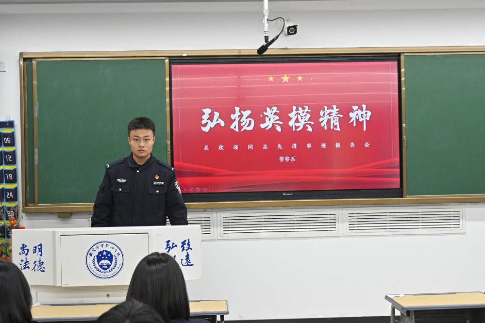 吳秋瑾同志現任安徽省女子監獄三級高級警長,她堅守工作一線二十九年,始終如一。她以耐心、愛心和細心塑心育人,點亮迷途者的心。她的故事如同一股清泉燈,即便在被確診為漸凍癥的情況下,她依然不屈不撓,不改初心,始終保持著滾燙的熱情,她的英模精神滋潤著每一個聽眾的心田。同學們觀看了吳秋瑾同志的先進事跡視頻,發表了觀后感想。吳秋瑾同志的事跡深深地感染了與會者們,吳秋瑾以敢為人先的銳氣、一往無前的勇氣、堅韌不拔的志氣,為警徽添彩,為警服增色。她的英模精神更是成為了預備警員們汲取力量的榜樣。