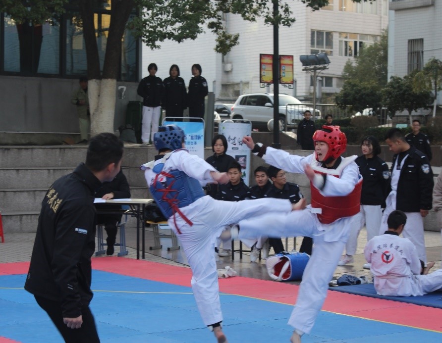 跆拳道競(jìng)技比賽是學(xué)院體育教學(xué)、業(yè)余訓(xùn)練的一次成果檢驗(yàn),是學(xué)生鍛煉意志品質(zhì)、提升競(jìng)技水平的重要途徑。通過舉辦學(xué)院首屆“藍(lán)鋒杯”跆拳道競(jìng)技比賽,鍛煉了參與賽事學(xué)生的組織協(xié)調(diào)能力,豐富了校園課余文化生活,增強(qiáng)了警察類院校警察體育的文化氛圍。