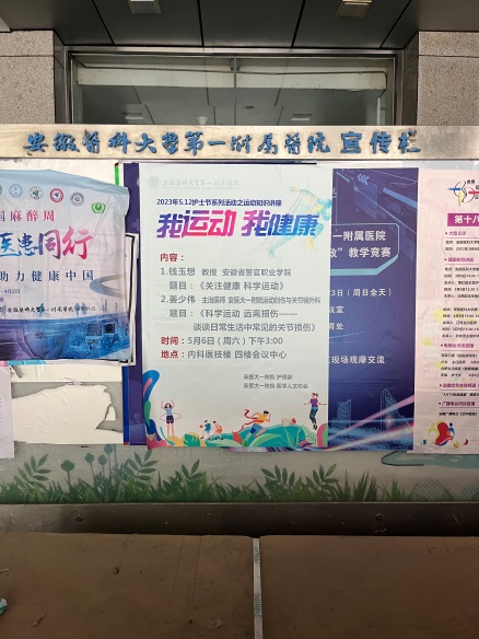 5月6日下午3點,警體部錢玉想受邀至安醫大一附院績溪路院區內科醫技樓四樓會議中心,進行了題為“關注健康、科學運動”的知識講座。