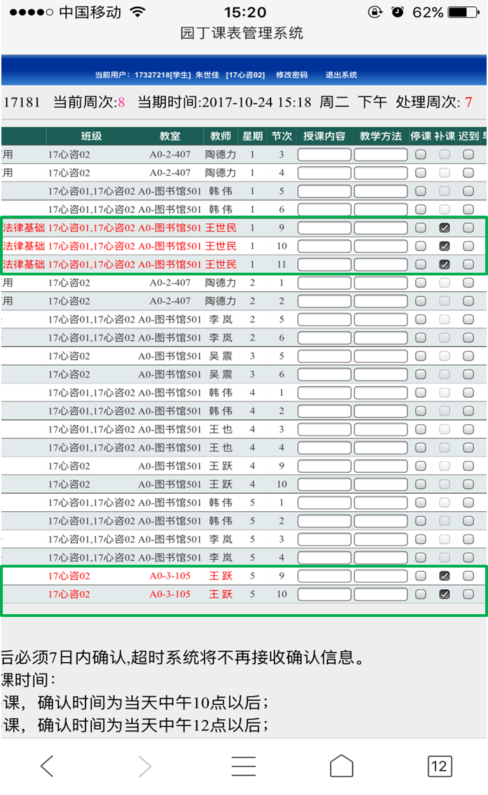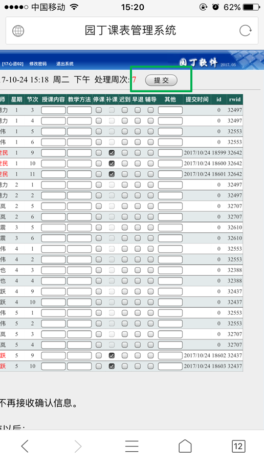 針對補課已完成的教師課程,在“補課”條目下方框內進行勾選,如圖3,點擊右上方“提交”按鈕,如圖4: