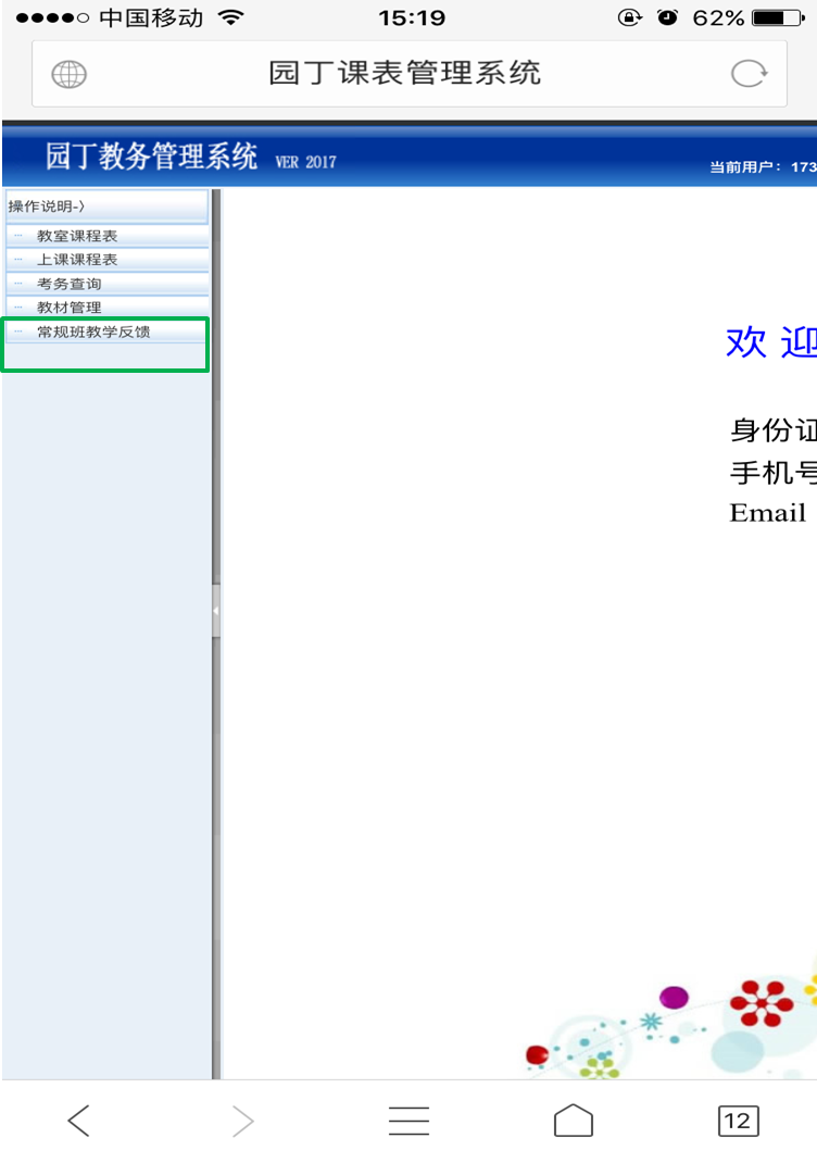 打開安徽警官職業學院校園網,點擊圖標或,(或登錄網址http://218.22.26.105/),點擊“課表考務”,輸入用戶名(學號)及密碼(原始密碼為1234,登錄后需修改密碼)登錄系統,點擊左側常規班教學反饋(或選修課教學反饋),如圖1。在彈出的課表頁面,點擊下拉框選擇補課周次(1-18),如圖2: