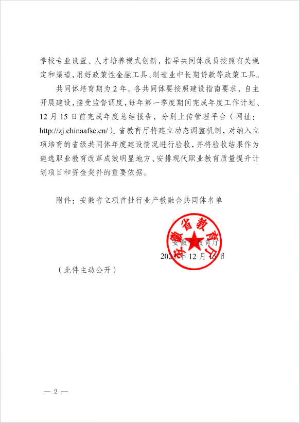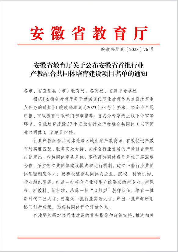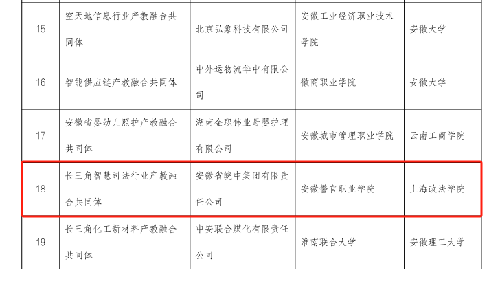 近日,安徽省教育廳發布《關于公布安徽省首批行業產教融合共同體培育建設項目名單的通知》(皖教秘職成〔2023〕76號),學院“長三角智慧司法行業產教融合共同體”成功入選安徽省首批行業產教融合共同體建設名單,“長三角智慧司法行業產教融合共同體”是以我院為牽頭職業學院、上海政法學院為牽頭高水平大學、安徽省皖中集團有限責任公司為牽頭企業,經企業自愿申報、市級教育行政部門初審推薦、省內外專家線上線下評審等程序完成項目立項。這是學院在“十四五”發展關鍵時期取得的又一重要成果,為學院持續推動職業教育高質量發展奠定了堅實基礎。