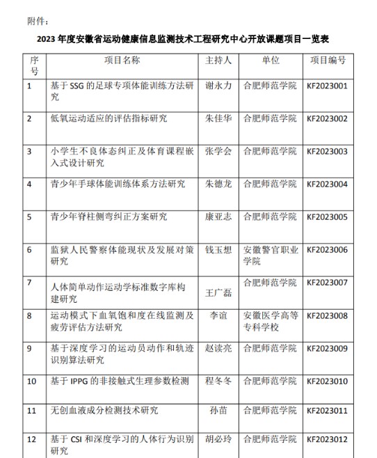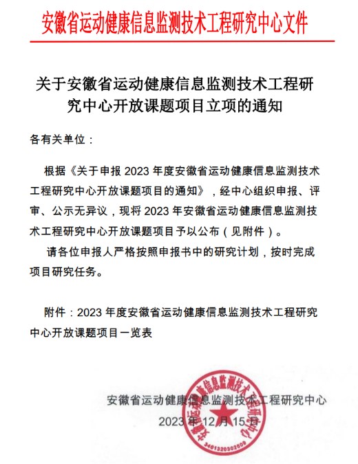 根據《關于申報2023年度安徽省運動健康信息監測技術工程研究中心開放課題項目的通知》文件精神,安徽警官職業學院“警察健康監測與運動技能發展研究中心”教科研團隊的主要成員以《監獄人民警察體能現狀及發展對策研究》為題撰寫了課題項目申請書。經學院審核、推薦,于2023年12月15日獲得立項,項目編號為:KF2023006。安徽省運動健康信息監測技術工程研究中心是合肥師范學院與企業聯合共建的安徽省發改委立項建設的省級科研平臺,接受國內外相關學科的學者和研究人員的項目申報。2023 年度安徽省運動健康信息監測技術工程研究中心開放課題項目所立項人員中,本科院校占比為85%,學院體育教科研團隊能夠順利立項,體現了研究中心人員在體育學領域科研能力不斷增強。