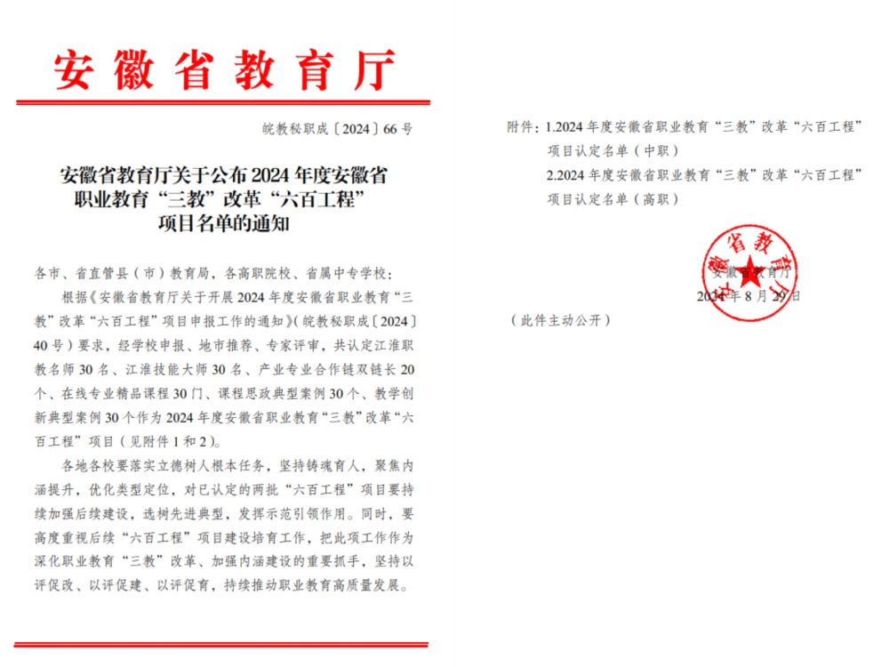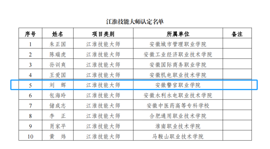根據《安徽省教育廳關于公布2024年度安徽省職業教育“三教”改革“六百工程”項目名單的通知》(皖教秘職成〔2024〕66號)文件精神,我院劉輝教授獲評“江淮技能大師”。這是我院深化職業教育“三教”改革,提高技能人才培養質量,建設安徽省“三教”改革示范校取得的又一成果。