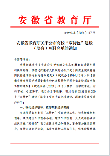 近日,安徽省教育廳發布《關于公布高校“雙特色”建設(培育)項目名單的通知》(皖教秘高〔2024〕117號),我院成功入選安徽省特色高校建設(培育)項目名單,這是對學院整體辦學水平和人才培養質量的充分肯定。
