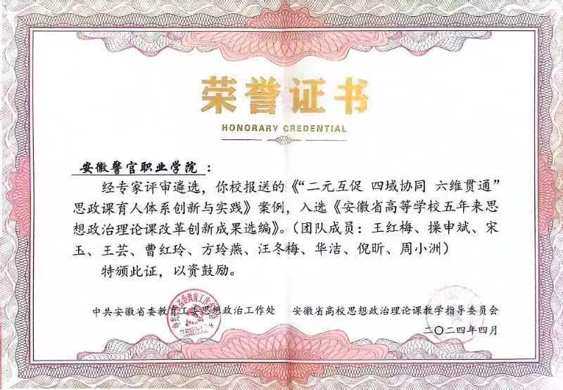 今年是習(xí)近平總書記在學(xué)校思想政治理論課教師座談會(huì)上的重要講話發(fā)表五周年,為深入貫徹落實(shí)習(xí)近平總書記重要講話精神,全面總結(jié)我省高校思政課建設(shè)與改革的經(jīng)驗(yàn),省教育廳思政處根據(jù)省委教育工委工作部署,面向全省高校征集思想政治理論課建設(shè)和改革創(chuàng)新成果和優(yōu)秀教學(xué)案例各20個(gè)。經(jīng)專家評(píng)審遴選,馬克思主義學(xué)院報(bào)送的《“二元互促 四域協(xié)同 六維貫通”思政課育人體系創(chuàng)新與實(shí)踐》教學(xué)成果,在獲得省級(jí)教學(xué)成果二等獎(jiǎng)后,再次入選《安徽省高等學(xué)校五年來(lái)思想政治理論課改革創(chuàng)新成果選編》。該成果團(tuán)隊(duì)成員主要有王紅梅、操申斌、宋玉、王蕓、曹紅玲、方玲燕等。