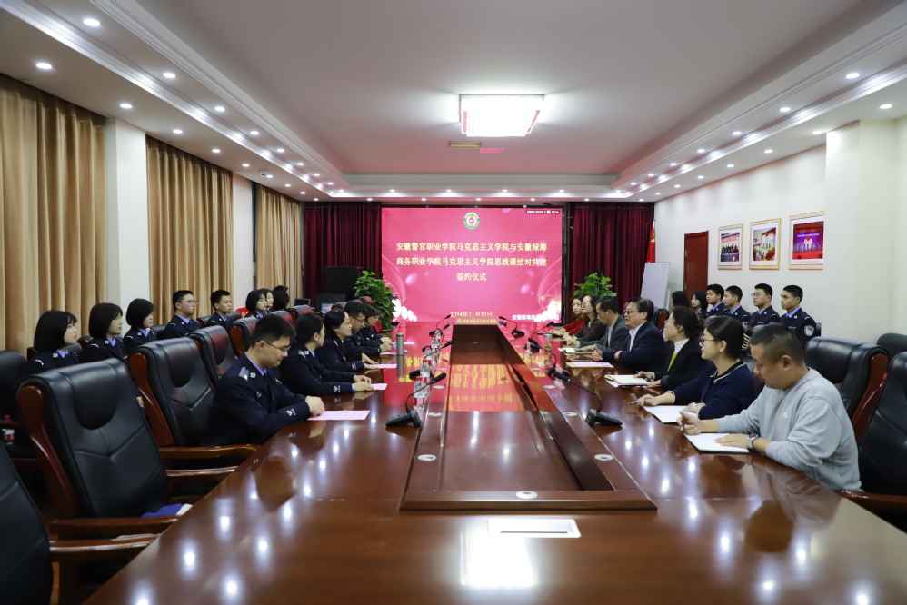安徽綠海商務職業學院馬克思主義學院黨支部書記祝中俠主持了結對共建協議書簽約儀式。他指出,安徽警官職業學院馬克思主義學院是安徽省首批高職高專院校重點馬院建設單位,名師薈萃、成果豐碩,希望雙方通過建立合作機制,開展黨建、教學、科研等方面的交流研討,優勢互補、攜手共進。王蕓表示,雙方將以結對共建為平臺,以資源共享、師資互助、活動聯辦、項目共研、人才共育為依托,共同推進馬克思主義學院高質量發展。安徽警官職業學院與安徽綠海商務職業學院,都是各具特色、各有實力的辦學單位,相信會走出一條思政課共建、馬院共建的協同育人新路。