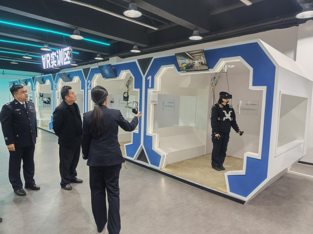 在四川司法警官職業學院,馬克思主義學院院長李士虎、副院長秦全斌等同志熱情接待了調研組一行。李士虎詳細地介紹了四川警院在大思政課實踐教學基地和思政課教師隊伍建設上的先進經驗和做法。會后,調研組參觀了虛擬仿真實訓基地。